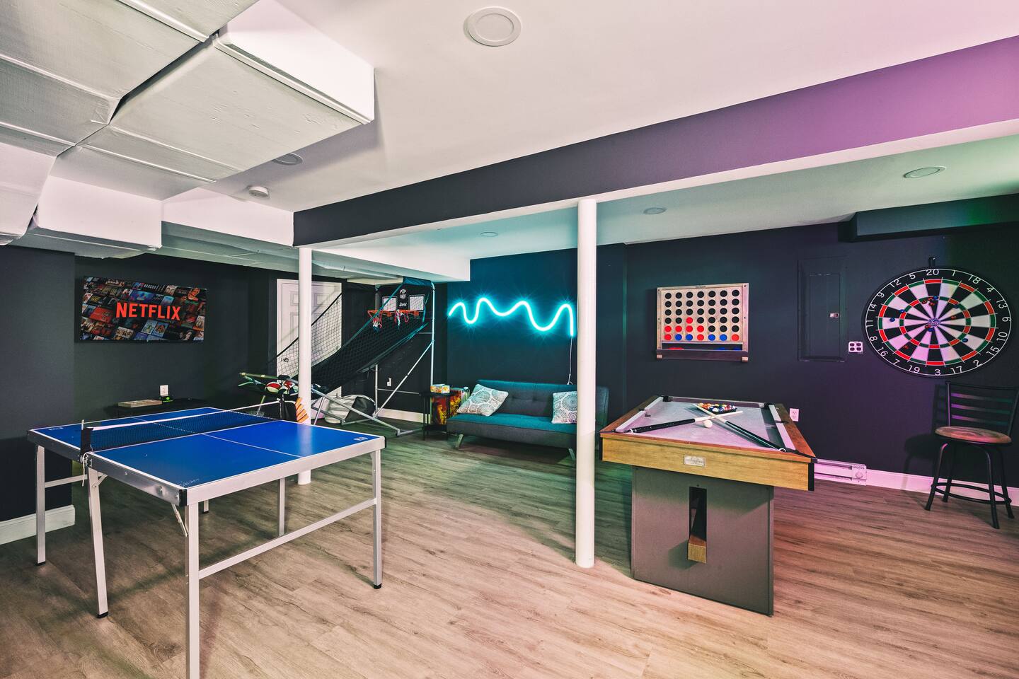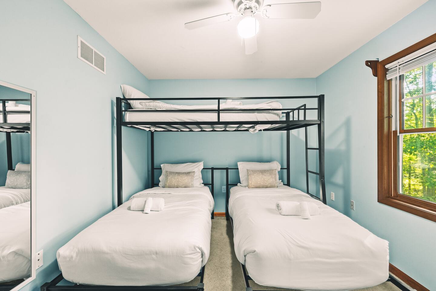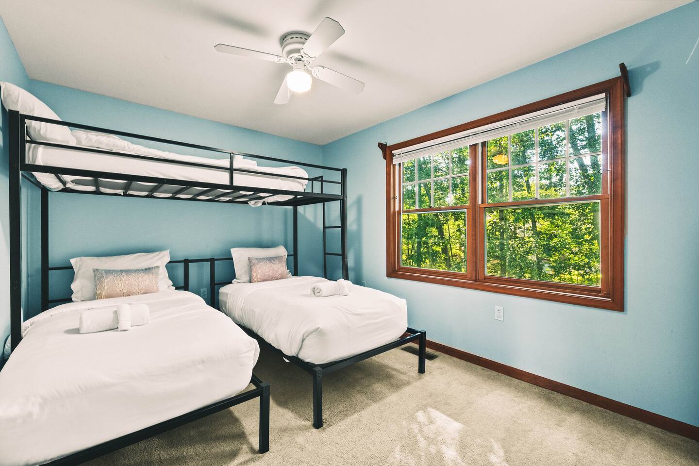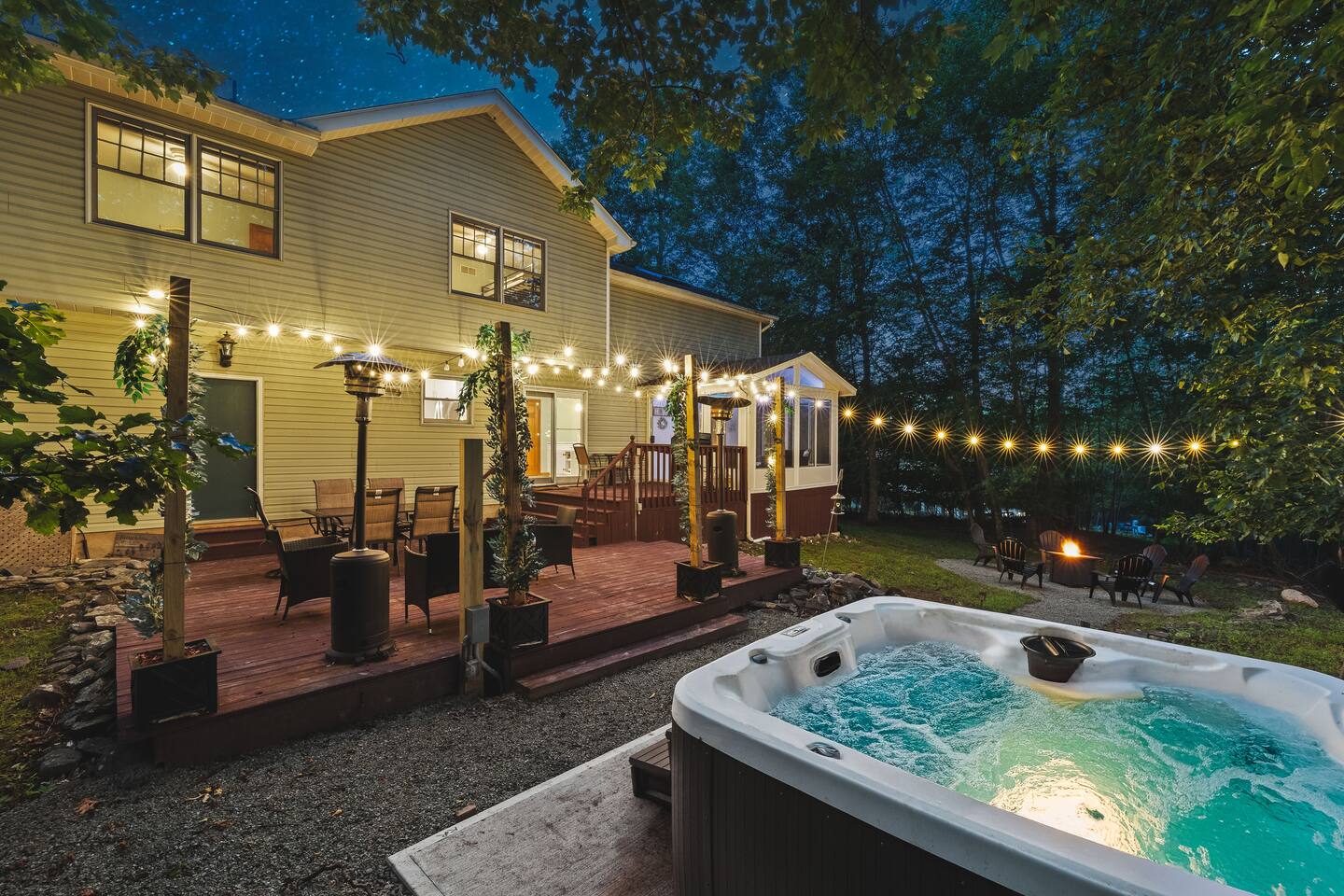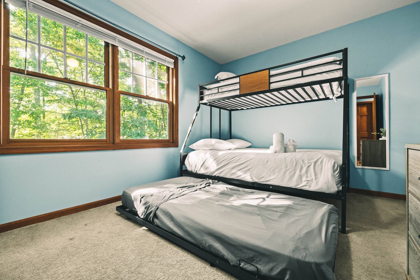 KEY FEATURES: ☀ 4 bedrooms, 7 beds plus queen sleeper sofa. Sleeps 12 very comfortably. ☀ 3 full baths, 1 half bathroom ☀ Only Small and Medium-sized dogs allowed (up to 50 lbs.) ☀ Central air for heating and cooling throughout the house. ☀ Modern kitchen; stainless steel appliances and kitchen island seating open to the dining area ☀ Sunny living room; comfy furniture, propane fireplace, flat-screen Smart TV ☀ Game room with pool, ping pong, wall mount hook & ring game, smart TV & seating area ☀ Great outdoor space: deck with propane BBQ, & table seating for 6, lounge seating for 5 around the propane fire table with propane space heaters! ☀ High-speed Wi-Fi ☀ Washer + dryer ☀ Free onsite parking in the driveway for up to 4 cars. ☀ HOA Access. ☀ After booking, we will send you a form to complete so we can submit the HOA renter permit on your behalf. ☀ Easy access to nearby attractions; Camelback Mountain, indoor water parks + outdoor activities ☀ Early or late check-out provided at $25/hr, only if we confirm it can be accommodated. ✅ Easy Check-In Process for your rental agreement, ID verification, & security hold It’s just like when you check in at a hotel and give your ID and security deposit to the front desk, except our front desk is online! It's super easy to complete on your phone! We use a web-based system called Happy Guest, and you’ll receive a personalized rental agreement, ID verification, and options of a simple security hold of $1,000 (which is not a security deposit) or a non-refundable $45 damage waiver fee to receive your arrival instructions. It’s simple: finish these steps, and you’re all set to enjoy your stay! Note: arrival info won’t be sent without completing these steps, and refunds aren’t possible if skipped. Your personalized guidebook will give you all the info about the home, my favorite local spots, automatic early check-in notifications, and sometimes even late checkout! You can even share it with friends and family! Got questions? Just message us anytime! ☆☆ BEDROOMS & BATHROOMS ☆☆ Our comfortable three (2) story, plus basement, home features four (4) bedrooms, each designed to provide a restful and productive stay. One bedroom is on the first floor with the remaining three (3) upstairs on the 2nd floor. The house has three (3) full bathrooms and one (1) half bath. All bedrooms provide plenty of natural light, bedside tables with lights and chargers for all your device charging needs. Each bedroom offers ample storage space for your belongings in the accessible closets, dressers, and luggage racks. The first floor bedroom has a Queen size bed. The three (3) bedrooms upstairs consist of a master bedroom with King bed and ensuite full bath, bunk beds with one (1) full and one (1) twin bed, bunk bed with three (3) twin beds, one being lofted. Additionally the house has three (3) bonus beds, one (1) Queen sleeper sofa in the living room, one (1) daybed in the loft and one (1) full size futon in the basement. ☆☆ KITCHEN & LIVING ROOM☆☆ The open-concept layout of the common areas makes it easy to feel like part of the action no matter where you are on either floor. The fully-equipped kitchen on the main floor is outfitted with a coffee machine, stainless steel appliances, including a refrigerator, stove, oven, and dishwasher, making it easy for you to cook a wonderful family meal as if you were at home during your stay. Whether you're enjoying a family dinner or a casual meal with friends, the indoor dining table that seats eight (8) plus two (2) seats at the adjacent kitchen island is the perfect spot to gather and share a meal. If you prefer to dine al fresco, step through the double doors onto the deck where you'll find a table for six (6) plus four (4) in the lounge chairs around the propane fire pit. The living room on the main level is the perfect place to relax and unwind after a long day of exploring the Poconos. Cozy up on the couches and watch your favorite shows on the flat-screen Smart TV, or enjoy a break from screen time with a good book. ☆☆ GAME ROOM☆☆ Head down to the basement and you’ll find our well-equipped game room. Whether gaming on the ping pong or pool tables or lounging on the couch to catch the game it's a perfect escape for those cold Poconos nights! ☆☆ OUTSIDE SPACE ☆☆ Escape to the beauty of the Pocono Mountains and experience the ultimate in outdoor living with our back deck featuring a dining table for six (6) plus seating for four (6) around the gas fire place, plus a gas grill for alfresco meals with family and friends. To top it all off, we have a (6) seater hot-tub that is now open for use! There is plenty of space to hang out in the backyard to enjoy the fresh air, play some fun outdoor games, play on the swings attached to the underside of the deck, or make s’mores around the gas-burning fire pit! This cozy home is in a great location just a short drive to nearby attractions, including Kalahari Resort, Camelback, Shawnee Mountain, Mount Airy Casino, Great Wolf Lodge, and more! ★☆ Book Today & Let Us Take Care Of You In East Stroudsburg! ☆★