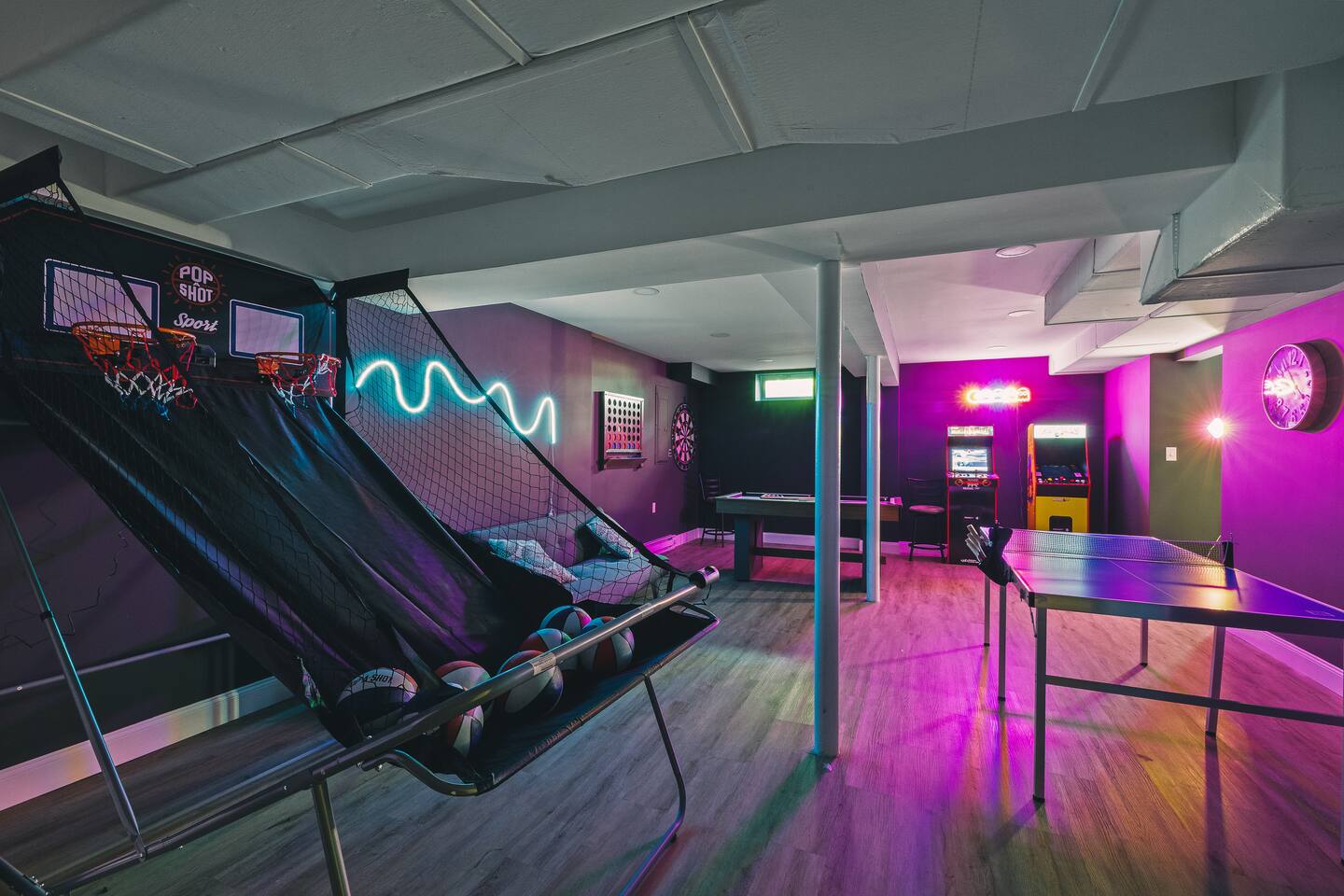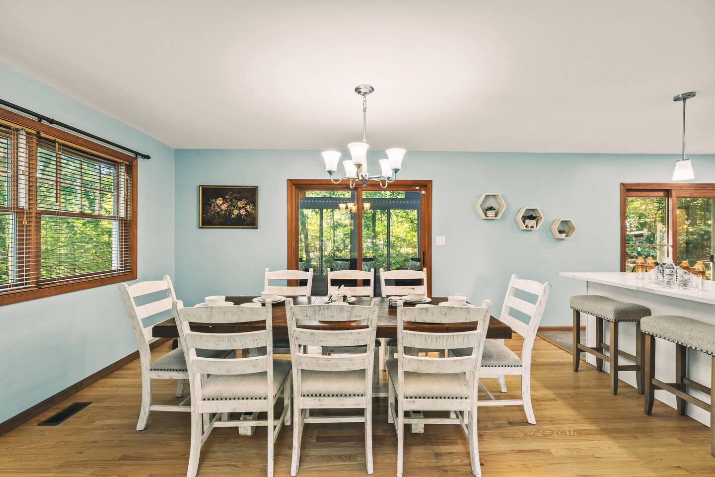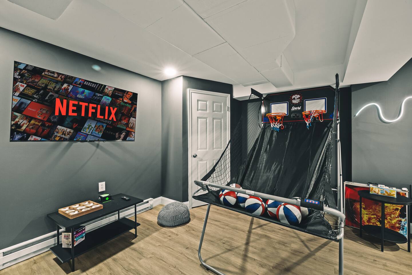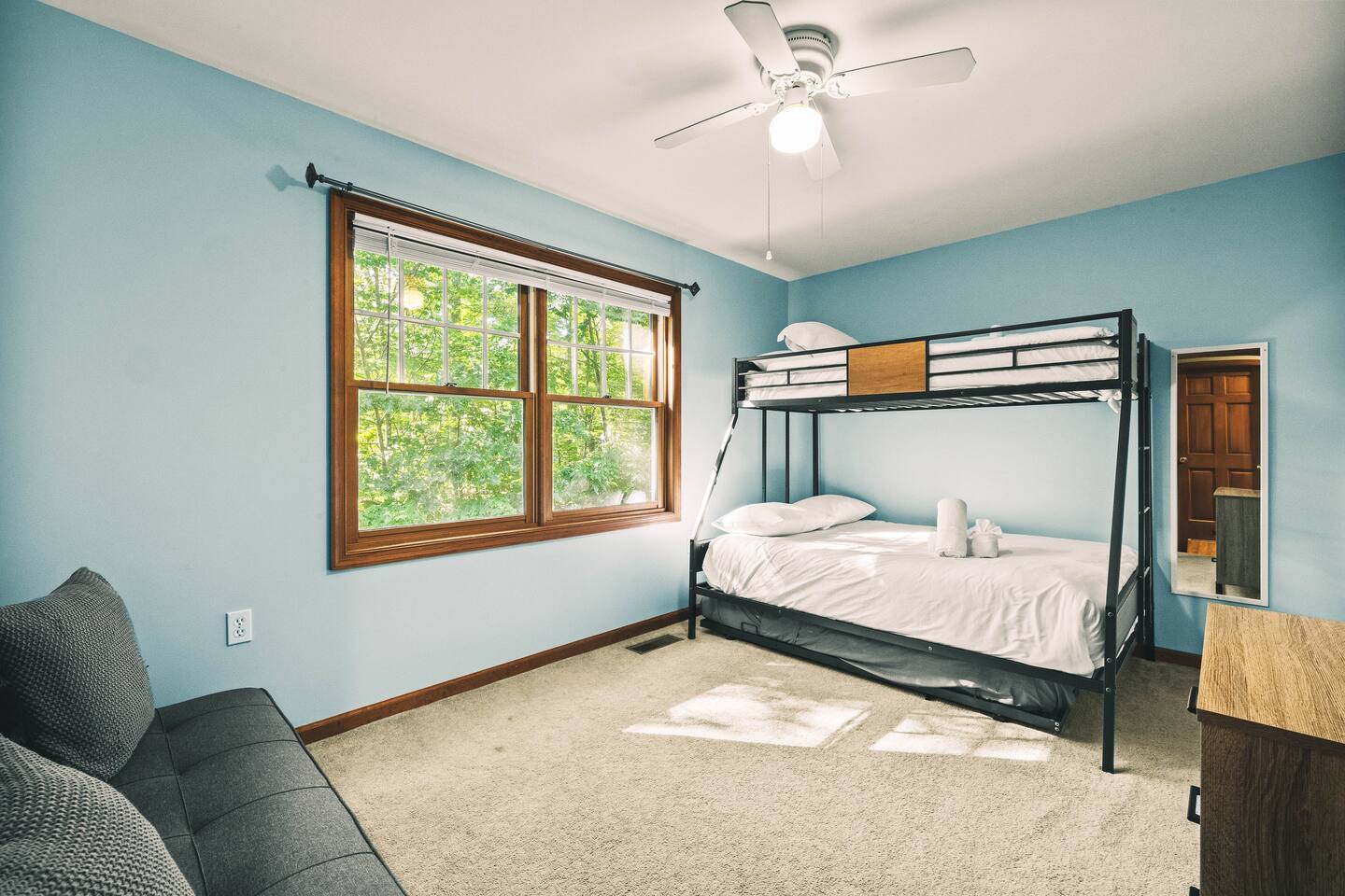 KEY FEATURES: ☀ 4 bedrooms, 7 beds plus queen sleeper sofa. Sleeps 12 very comfortably. ☀ 3 full baths, 1 half bathroom ☀ Only Small and Medium-sized dogs allowed (up to 50 lbs.) ☀ Central air for heating and cooling throughout the house. ☀ Modern kitchen; stainless steel appliances and kitchen island seating open to the dining area ☀ Sunny living room; comfy furniture, propane fireplace, flat-screen Smart TV ☀ Game room with pool, ping pong, wall mount hook & ring game, smart TV & seating area ☀ Great outdoor space: deck with propane BBQ, & table seating for 6, lounge seating for 5 around the propane fire table with propane space heaters! ☀ High-speed Wi-Fi ☀ Washer + dryer ☀ Free onsite parking in the driveway for up to 4 cars. ☀ HOA Access. ☀ After booking, we will send you a form to complete so we can submit the HOA renter permit on your behalf. ☀ Easy access to nearby attractions; Camelback Mountain, indoor water parks + outdoor activities ☀ Early or late check-out provided at $25/hr, only if we confirm it can be accommodated. ✅ Easy Check-In Process for your rental agreement, ID verification, & security hold It’s just like when you check in at a hotel and give your ID and security deposit to the front desk, except our front desk is online! It's super easy to complete on your phone! We use a web-based system called Happy Guest, and you’ll receive a personalized rental agreement, ID verification, and options of a simple security hold of $1,000 (which is not a security deposit) or a non-refundable $45 damage waiver fee to receive your arrival instructions. It’s simple: finish these steps, and you’re all set to enjoy your stay! Note: arrival info won’t be sent without completing these steps, and refunds aren’t possible if skipped. Your personalized guidebook will give you all the info about the home, my favorite local spots, automatic early check-in notifications, and sometimes even late checkout! You can even share it with friends and family! Got questions? Just message us anytime! ☆☆ BEDROOMS & BATHROOMS ☆☆ Our comfortable three (2) story, plus basement, home features four (4) bedrooms, each designed to provide a restful and productive stay. One bedroom is on the first floor with the remaining three (3) upstairs on the 2nd floor. The house has three (3) full bathrooms and one (1) half bath. All bedrooms provide plenty of natural light, bedside tables with lights and chargers for all your device charging needs. Each bedroom offers ample storage space for your belongings in the accessible closets, dressers, and luggage racks. The first floor bedroom has a Queen size bed. The three (3) bedrooms upstairs consist of a master bedroom with King bed and ensuite full bath, bunk beds with one (1) full and one (1) twin bed, bunk bed with three (3) twin beds, one being lofted. Additionally the house has three (3) bonus beds, one (1) Queen sleeper sofa in the living room, one (1) daybed in the loft and one (1) full size futon in the basement. ☆☆ KITCHEN & LIVING ROOM☆☆ The open-concept layout of the common areas makes it easy to feel like part of the action no matter where you are on either floor. The fully-equipped kitchen on the main floor is outfitted with a coffee machine, stainless steel appliances, including a refrigerator, stove, oven, and dishwasher, making it easy for you to cook a wonderful family meal as if you were at home during your stay. Whether you're enjoying a family dinner or a casual meal with friends, the indoor dining table that seats eight (8) plus two (2) seats at the adjacent kitchen island is the perfect spot to gather and share a meal. If you prefer to dine al fresco, step through the double doors onto the deck where you'll find a table for six (6) plus four (4) in the lounge chairs around the propane fire pit. The living room on the main level is the perfect place to relax and unwind after a long day of exploring the Poconos. Cozy up on the couches and watch your favorite shows on the flat-screen Smart TV, or enjoy a break from screen time with a good book. ☆☆ GAME ROOM☆☆ Head down to the basement and you’ll find our well-equipped game room. Whether gaming on the ping pong or pool tables or lounging on the couch to catch the game it's a perfect escape for those cold Poconos nights! ☆☆ OUTSIDE SPACE ☆☆ Escape to the beauty of the Pocono Mountains and experience the ultimate in outdoor living with our back deck featuring a dining table for six (6) plus seating for four (6) around the gas fire place, plus a gas grill for alfresco meals with family and friends. To top it all off, we have a (6) seater hot-tub that is now open for use! There is plenty of space to hang out in the backyard to enjoy the fresh air, play some fun outdoor games, play on the swings attached to the underside of the deck, or make s’mores around the gas-burning fire pit! This cozy home is in a great location just a short drive to nearby attractions, including Kalahari Resort, Camelback, Shawnee Mountain, Mount Airy Casino, Great Wolf Lodge, and more! ★☆ Book Today & Let Us Take Care Of You In East Stroudsburg! ☆★