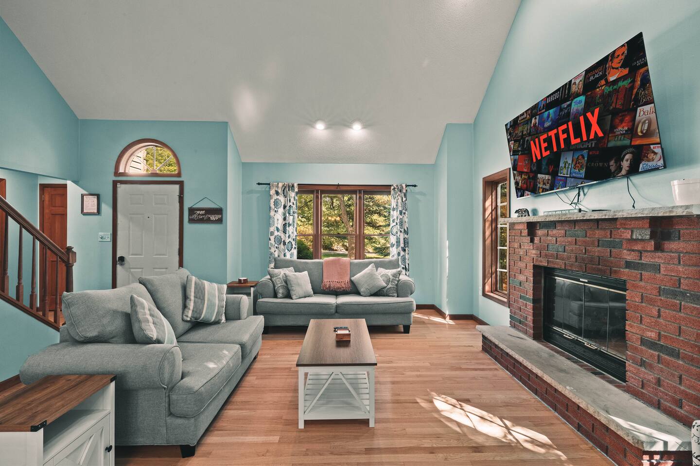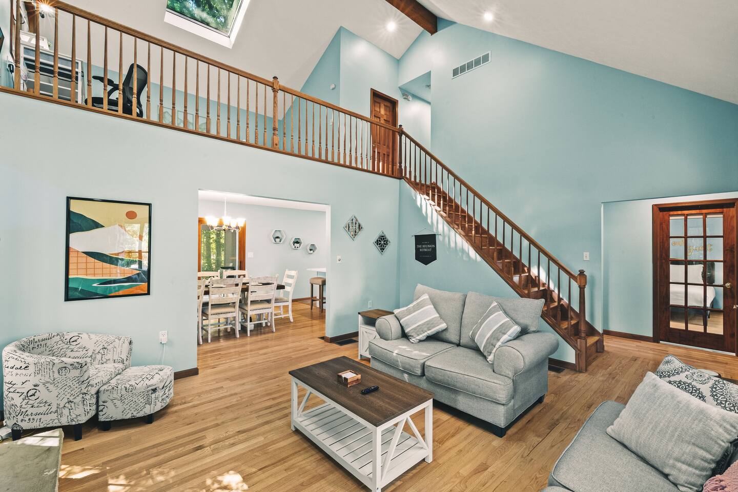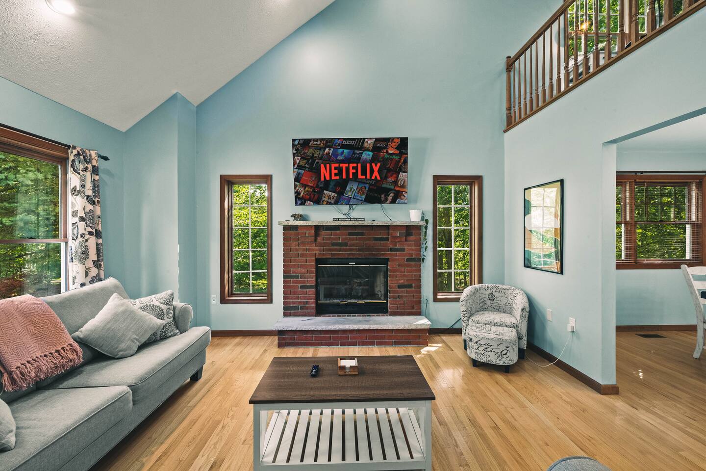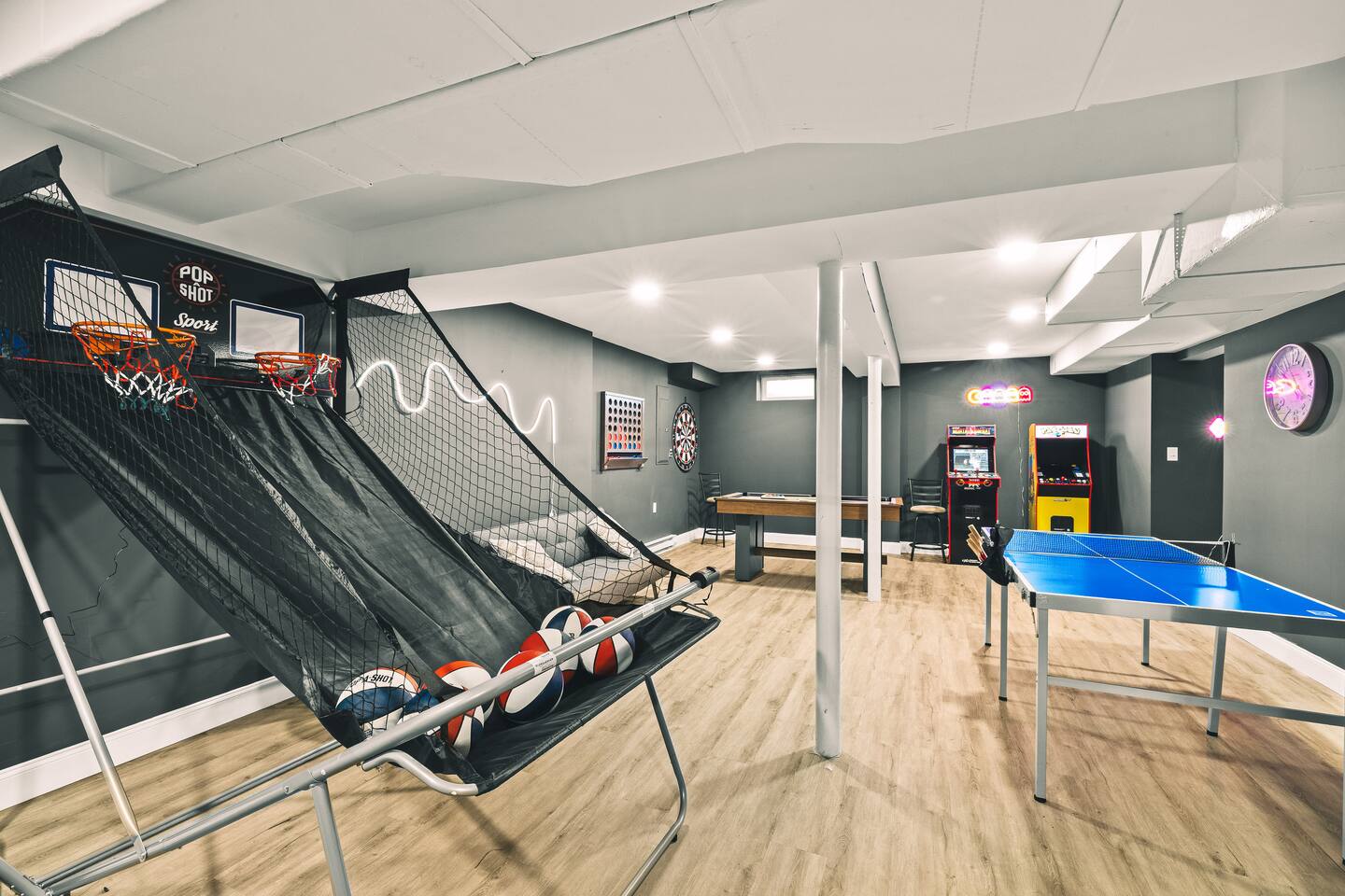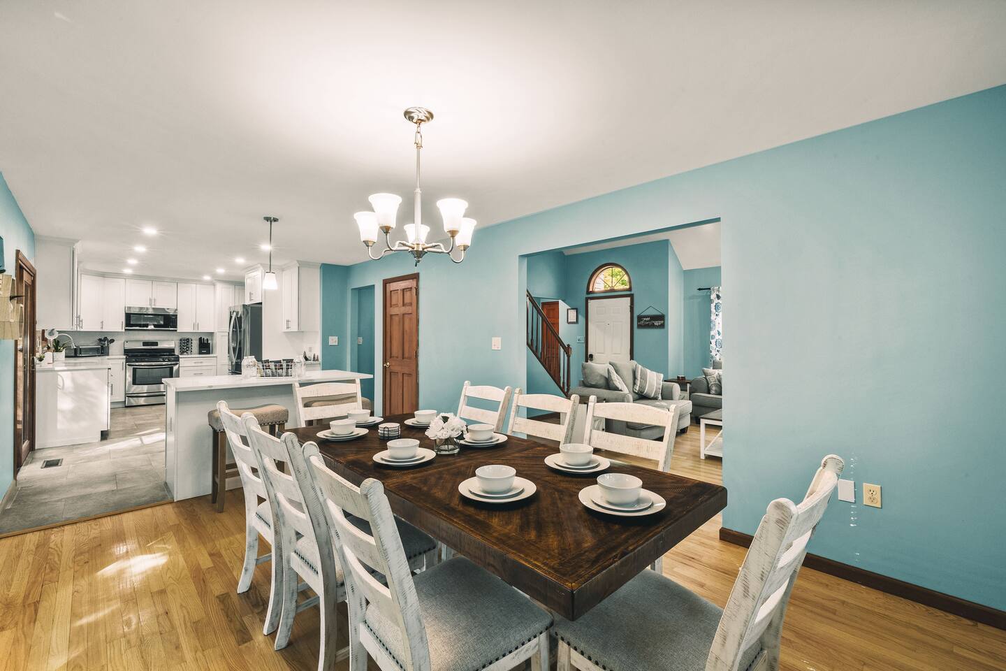 KEY FEATURES: ☀ 4 bedrooms, 7 beds plus queen sleeper sofa. Sleeps 12 very comfortably. ☀ 3 full baths, 1 half bathroom ☀ Only Small and Medium-sized dogs allowed (up to 50 lbs.) ☀ Central air for heating and cooling throughout the house. ☀ Modern kitchen; stainless steel appliances and kitchen island seating open to the dining area ☀ Sunny living room; comfy furniture, propane fireplace, flat-screen Smart TV ☀ Game room with pool, ping pong, wall mount hook & ring game, smart TV & seating area ☀ Great outdoor space: deck with propane BBQ, & table seating for 6, lounge seating for 5 around the propane fire table with propane space heaters! ☀ High-speed Wi-Fi ☀ Washer + dryer ☀ Free onsite parking in the driveway for up to 4 cars. ☀ HOA Access. ☀ After booking, we will send you a form to complete so we can submit the HOA renter permit on your behalf. ☀ Easy access to nearby attractions; Camelback Mountain, indoor water parks + outdoor activities ☀ Early or late check-out provided at $25/hr, only if we confirm it can be accommodated. ✅ Easy Check-In Process for your rental agreement, ID verification, & security hold It’s just like when you check in at a hotel and give your ID and security deposit to the front desk, except our front desk is online! It's super easy to complete on your phone! We use a web-based system called Happy Guest, and you’ll receive a personalized rental agreement, ID verification, and options of a simple security hold of $1,000 (which is not a security deposit) or a non-refundable $45 damage waiver fee to receive your arrival instructions. It’s simple: finish these steps, and you’re all set to enjoy your stay! Note: arrival info won’t be sent without completing these steps, and refunds aren’t possible if skipped. Your personalized guidebook will give you all the info about the home, my favorite local spots, automatic early check-in notifications, and sometimes even late checkout! You can even share it with friends and family! Got questions? Just message us anytime! ☆☆ BEDROOMS & BATHROOMS ☆☆ Our comfortable three (2) story, plus basement, home features four (4) bedrooms, each designed to provide a restful and productive stay. One bedroom is on the first floor with the remaining three (3) upstairs on the 2nd floor. The house has three (3) full bathrooms and one (1) half bath. All bedrooms provide plenty of natural light, bedside tables with lights and chargers for all your device charging needs. Each bedroom offers ample storage space for your belongings in the accessible closets, dressers, and luggage racks. The first floor bedroom has a Queen size bed. The three (3) bedrooms upstairs consist of a master bedroom with King bed and ensuite full bath, bunk beds with one (1) full and one (1) twin bed, bunk bed with three (3) twin beds, one being lofted. Additionally the house has three (3) bonus beds, one (1) Queen sleeper sofa in the living room, one (1) daybed in the loft and one (1) full size futon in the basement. ☆☆ KITCHEN & LIVING ROOM☆☆ The open-concept layout of the common areas makes it easy to feel like part of the action no matter where you are on either floor. The fully-equipped kitchen on the main floor is outfitted with a coffee machine, stainless steel appliances, including a refrigerator, stove, oven, and dishwasher, making it easy for you to cook a wonderful family meal as if you were at home during your stay. Whether you're enjoying a family dinner or a casual meal with friends, the indoor dining table that seats eight (8) plus two (2) seats at the adjacent kitchen island is the perfect spot to gather and share a meal. If you prefer to dine al fresco, step through the double doors onto the deck where you'll find a table for six (6) plus four (4) in the lounge chairs around the propane fire pit. The living room on the main level is the perfect place to relax and unwind after a long day of exploring the Poconos. Cozy up on the couches and watch your favorite shows on the flat-screen Smart TV, or enjoy a break from screen time with a good book. ☆☆ GAME ROOM☆☆ Head down to the basement and you’ll find our well-equipped game room. Whether gaming on the ping pong or pool tables or lounging on the couch to catch the game it's a perfect escape for those cold Poconos nights! ☆☆ OUTSIDE SPACE ☆☆ Escape to the beauty of the Pocono Mountains and experience the ultimate in outdoor living with our back deck featuring a dining table for six (6) plus seating for four (6) around the gas fire place, plus a gas grill for alfresco meals with family and friends. To top it all off, we have a (6) seater hot-tub that is now open for use! There is plenty of space to hang out in the backyard to enjoy the fresh air, play some fun outdoor games, play on the swings attached to the underside of the deck, or make s’mores around the gas-burning fire pit! This cozy home is in a great location just a short drive to nearby attractions, including Kalahari Resort, Camelback, Shawnee Mountain, Mount Airy Casino, Great Wolf Lodge, and more! ★☆ Book Today & Let Us Take Care Of You In East Stroudsburg! ☆★